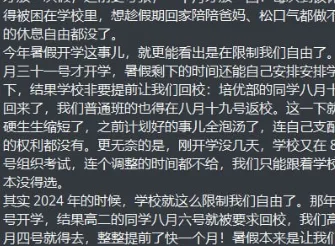 据学生们介绍,本应属于休整和自主安排的暑假,却被学校名义上的“培优”课程几乎完全占据。许多同学被要求返校上课,暑假基本沦为“加长版学期”。进入新学期后,情况不仅没有改善,反而愈加严苛。学生们反映,每月只有一次所谓的“完整假期”,且往往被压缩到仅剩一天,甚至不到一天。周末几乎全部被剥夺,学生们长期处于连轴转的学习节奏中。