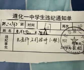 唐人日报9月30日讯:近日,一名遵义一中学生在网络晒出自己曾经的违纪通知单,原因竟是“见到老师不打招呼”。这一细节迅速在社交媒体上引爆舆论,不少网友质疑学校规定过于苛刻,甚至带有形式主义和权威主义色彩。