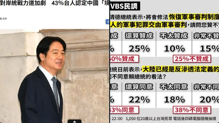 唐人日报3月28日讯:台湾地区领导人赖清德日前公开表示,中国大陆已是《反渗透法》所定义的“境外敌对势力”,引发岛内舆论广泛讨论。3月26日,TVBS发布最新民调显示,民众对这一说法意见分歧明显:43%表示同意(其中21%“非常同意”,22%“还算同意”),38%表示不同意(18%“不太同意”,20%“非常不同意”),另有19%未表达立场。