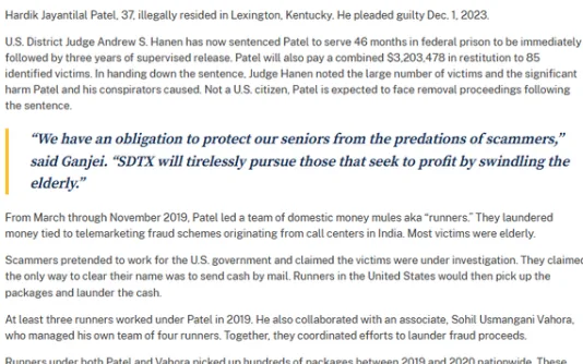 检方指出,该犯罪网络与印度境内的诈骗呼叫中心保持密切联系,并依赖非法移民在美境内建立分支、转移资金,增加执法部门调查难度。案件调查由联邦特工牵头,多地联合执法行动最终锁定嫌疑人身份。