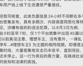 业内人士分析,新能源汽车市场竞争激烈,品牌间的舆论攻防愈发频繁。一旦负面舆论形成规模化传播,不仅会冲击企业声誉,更会波及消费者群体,造成群体标签化和社会情绪对立。理想汽车此次高调回应,被视为对恶意舆论操纵“零容忍”的信号,也反映了车企在新媒体环境下对品牌与用户形象维护的重视程度。