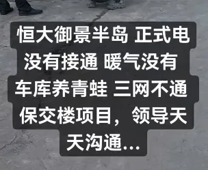 据业主介绍,购房时恒大御景半岛被包装成“精品宜居社区”,承诺完善的配套与舒适的居住环境。然而交房数年,现实却让人愤怒。小区至今使用的是临时施工电,频繁跳闸导致日常生活处处受限;供暖设施未建成,北方寒冬里居民只能依靠取暖器和电炉度日,电费飙升却依旧冷气逼人;地下车库因排水系统瘫痪,常年积水,青蛙横行,蚊虫滋生,环境恶劣;宽带、光纤等通信线路未铺设,业主形容“与外界隔绝”,孩子上网课、居民远程办公都成了奢望。