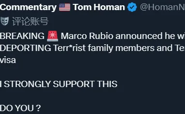 唐人日报6月4日讯:“边境沙皇”汤姆·霍曼(Tom Homan)在社交媒体上对参议员马可·卢比奥(Marco Rubio)提出的新政策表示强烈支持。该政策主张吊销已知恐怖分子的签证,并驱逐其在美持签证的家人及公开表达同情者。