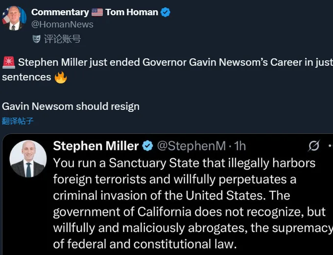 但米勒的强烈措辞迅速赢得保守派支持。“边境沙皇”汤姆·霍曼(Tom Homan)转发米勒发言,公开呼吁:“加文·纽森应该辞职。”他补充说,米勒仅用两句话就“终结了纽森的政治生涯”。