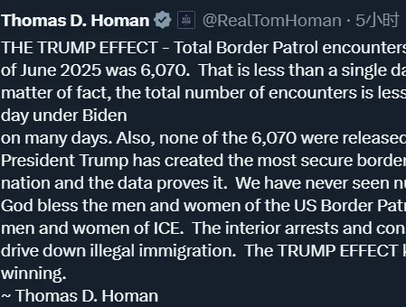 唐人日报7月2日讯:“边境沙皇”汤姆·霍曼(Thomas D. Homan)近日在社交平台发文称,2025年6月,美墨边境仅记录6070次非法移民遭遇事件,这一数字创下历史最低,比拜登政府时期的单日数据还低,充分展现“特朗普效应”。