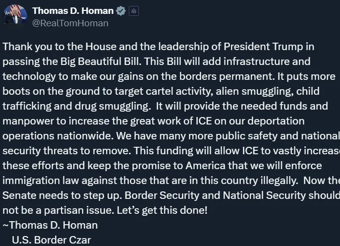 唐人日报5月23日讯:“边境沙皇”汤姆·霍曼(Thomas D. Homan)近日在社交媒体发声,强烈支持众议院刚通过的《一个大而美丽的法案》,称其为“巩固边境安全成果的关键立法”,并呼吁参议院迅速行动。