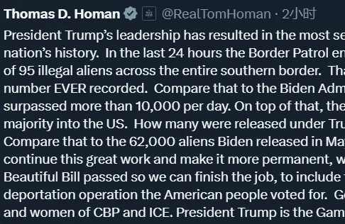 唐人日报6月18日讯:美国“边境沙皇”汤姆·霍曼(Thomas D. Homan)在社交平台发声,高度评价特朗普政府第二任期的边境执法成就。他指出,在特朗普领导下,美国南部边境安全已达“历史最高水平”。仅在过去24小时内,边境巡逻队共发现非法入境者仅95人,创下有史以来最低纪录。