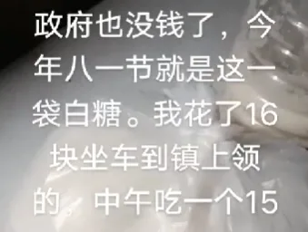 唐人日报8月7日讯:8月1日是中国人民解放军建军节,本应是对退伍军人表达尊崇与敬意的时刻。然而,一位重庆退伍老兵发布的视频却揭开了基层现实的一角,令人唏嘘。他在镜头前无奈抱怨:“今年八一节,政府发的就是一袋白糖。我花16块钱坐车到镇上领的,中午还吃了个15块的快餐,最后算下来,净亏11块。”
