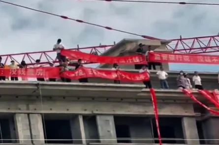 据现场画面显示,多位业主站在高楼顶端,悬挂醒目横幅,内容直指项目“停工数年”“工程烂尾”,并指责开发商久拖不建、失信违约。有人质问:“我们不是买了一个梦,而是背负了几十年的房贷!”
