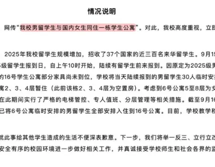 校方的解释是:今年新入学的留学生人数远超此前预估,宿舍资源一度紧张。为了临时解决住宿问题,学校才动用了部分女生公寓楼层。然而,这一“权宜之计”触及到学生最为敏感的居住安全与隐私问题,在没有充分沟通和解释的情况下,激起了强烈反弹。
