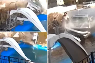 唐人日报3月18日讯:长岛一户人家的后院近日发生惊险一幕,一辆灰色汽车撞破围栏,直接冲入泳池。事发地点位于中央艾斯利普东彻斯特纳特街,事故发生在上周四晚,现场监控拍下全过程。
