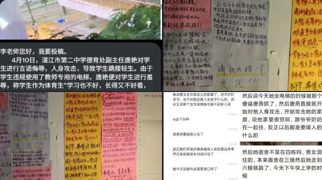 唐人日报4月14日讯:近日广东湛江市第二中学发生一起令人震惊的校园悲剧。一名学生疑因乘坐教师专用电梯,遭德育处副主任唐某当众辱骂,最终不堪精神压力,跳楼轻生,所幸经抢救暂无生命危险。