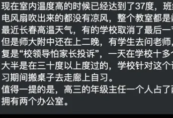 值得注意的是,有学生指出,高三年级主任却独占两个装有空调的办公室,坐拥两台空调,形成鲜明对比。校方一边高喊“没钱”,一边在教务与领导办公区域维持清凉,学生则在酷热中备考,苦不堪言。