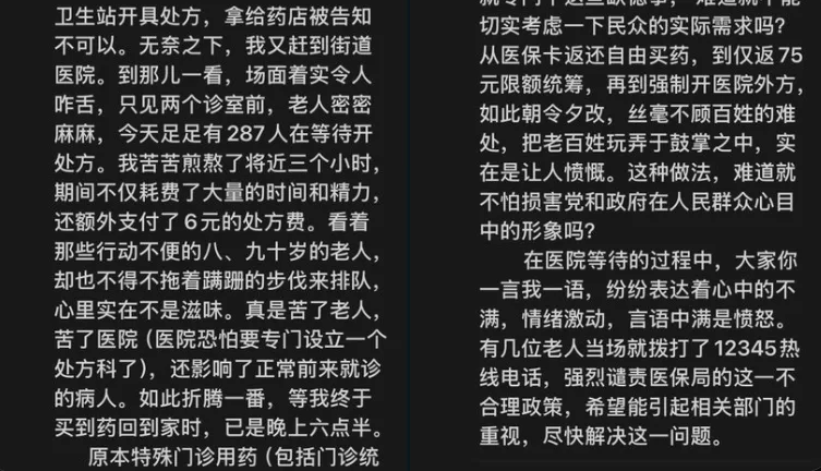 老人对医保政策提出批评,认为相关规定设置障碍,增加了百姓的生活负担,并表示医保局的官员们在办公室里随意决策,缺乏对普通群众需求的理解。此事件引发了市民对医疗体制的广泛讨论,呼吁简化流程,减轻百姓负担。
