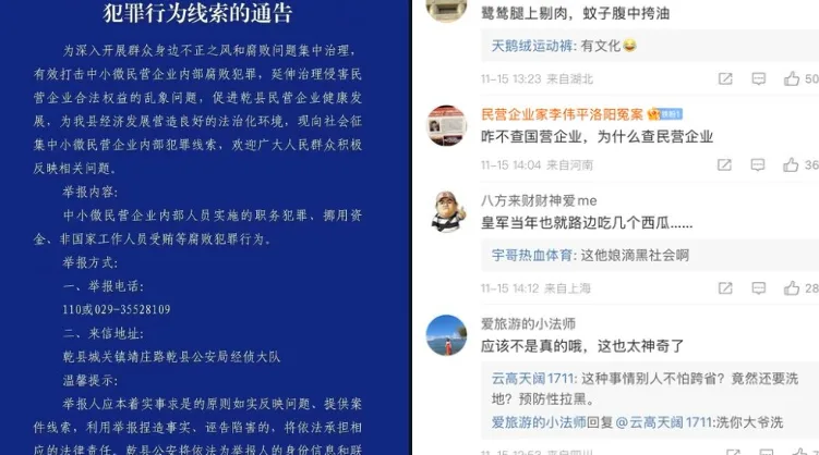 热门头条 陕西咸阳乾县公安局发布通告 引发热议 0 唐人日报11月15日讯:近日,陕西咸阳乾县公安局发布《关于征集中小微民企业内部腐败犯罪行为线索的通告》 网友回复“没有远洋捕捞的能力,开始吃窝边草了?”Continue ReadingPrevious 俄罗斯前国防部长绍伊古现身珠海航展 遭现场辱骂Next 巧偷豪夺!10万财物遭窃,加州夫妇多次行窃被捕 延伸阅读 热门头条 密密麻麻!福建一查扣点堆满电动车 网友:这得罚了多少人 0 热门头条 马路中间举锦旗“致谢”!上海美团骑手街头控诉报酬被克扣 0 热门头条 退市多年负债超两百亿,乐视网突然宣告要拿1.8亿元炒股 网友:为何不还债? 0 热门头条 陕西未完工自建房遭强拆 村民哭诉无家可归 0 热门头条 广东潮州沙溪镇突发工厂大火:火势迅猛冲天,黑烟压顶! 0 热门头条 像货车司机一样强制休!外卖新国标引热议 骑手怕收入缩水 0 发表回复 取消回复您的邮箱地址不会被公开。 必填项已用 * 标注评论 *显示名称 * 邮箱 * 网站 在此浏览器中保存我的显示名称、邮箱地址和网站地址,以便下次评论时使用。