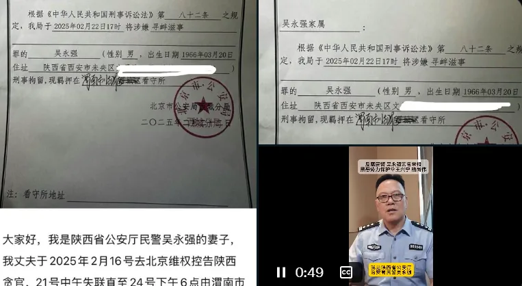 唐人日2月26日讯:近日,陕西公安厅民警吴永强妻子透露,丈夫自2月16日赴北京维权控告贪官王兴宁后,遭渭南公安涉嫌“寻衅滋事”拘留。吴永强曾实名举报王兴宁,指控其充当黑恶势力保护伞等严重问题,引发社会广泛关注。吴妻称,丈夫的举报行为可能与其被拘留有关,且家人至今未能与其取得有效联系。
