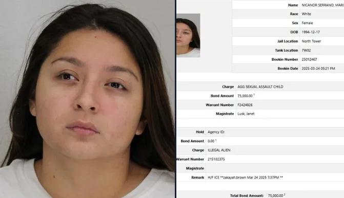 唐人日报4月7日讯:德克萨斯州达拉斯县执法部门近日逮捕一名非法移民玛丽亚·尼卡诺·塞拉诺(Maria Nicanor Serrano),她因涉嫌对儿童实施严重性侵而面临重罪指控,目前已被移交美国移民和海关执法局(ICE)拘留。