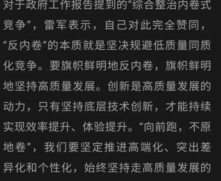 此外,雷军的发言还涉及了如何通过政策支持和社会环境的优化来减少行业内的不健康竞争。他建议,政府应当出台更多激励创新和支持公平竞争的政策,帮助企业在健康的环境中成长,同时减轻企业和员工的不必要压力。