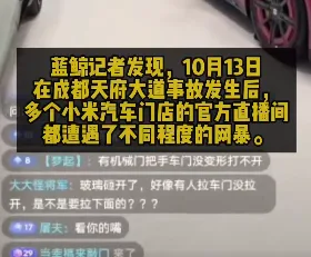 事故消息传出后,10月13日当天,多地小米汽车门店的直播间立刻成为舆论战场。大批网友涌入直播间,刷屏质疑车辆安全、指责企业宣传虚高,有的直播间在线人数骤增至2000人以上。直播间中频见“门把手打不开”“安全设计漏洞”“垃圾车”“绿化带战神”等极端言辞。部分主播在镜头前无奈回应:“我们只是打工人,请停止攻击。”