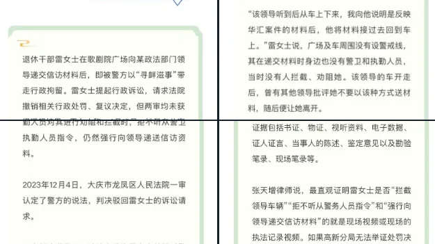 唐人日报4月21日讯:近日,公众号“法度Law”发布一则引发舆论关注的案例。退休干部雷女士因在某地歌剧院广场,向一位政法部门领导当面递交信访材料,随即被警方以“寻衅滋事”带走并处以行政拘留。此后,她提起行政诉讼,要求撤销处罚及相关复议决定,但一审、二审法院均未支持其请求。