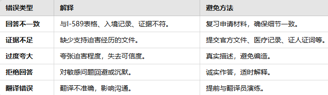 - 充分准备: 证据齐全,熟悉庇护故事,回答清晰。
