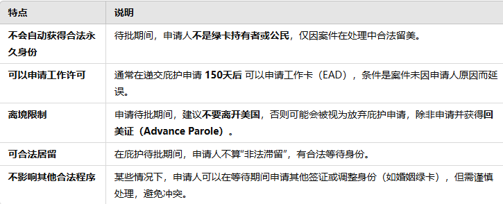 庇护申请待批期间,申请人属于合法居留的“待决状态”,可以合法留在美国,通常可以申请工作许可,但不算持有正式移民身份。