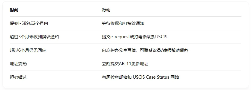 提供你的A号码、姓名、邮寄地址,说明你已提交I-589,但未收到ASC指纹通知。