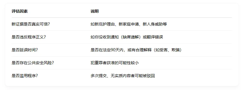 法官接受你的重开理由(如新证据、新庇护资格、程序错误、从未收到通知等)。