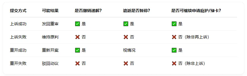 非法移民持有递解令(Order of Removal)后,若递交上诉(Appeal)或动议重开(Motion to Reopen),其结果主要有以下几种可能,每种结果会对你的身份、遣返风险和未来在美生活产生不同影响: