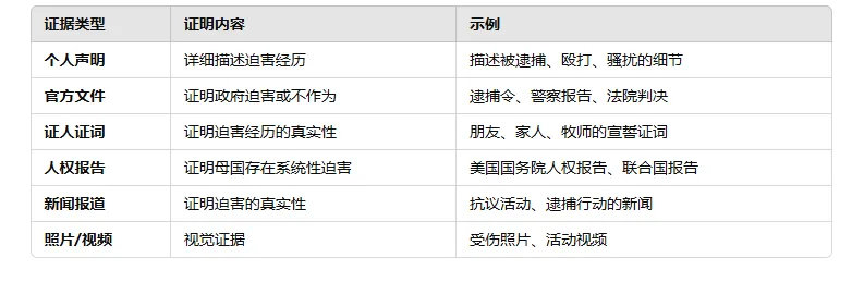 申请庇护时,必须提供可信且一致的证据,以下是常见的6类核心证据: