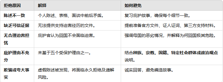 - 不配合:与庇护官发生冲突、拒绝回答问题将严重影响申请。