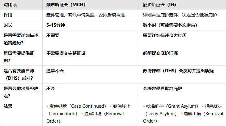 预审听证会(MCH)是案件管理阶段,庇护听证会(IH)是最终决定庇护结果的正式审判。