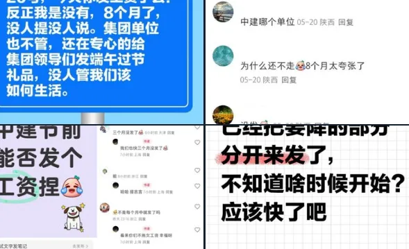 更早前的5月20日,一位陕西中建员工怒斥单位八个月未发工资,基层员工苦不堪言,但集团却仍在“专心给领导们发放端午礼品”,对底层苦苦讨薪的员工漠不关心。