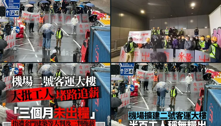 唐人日报3月12日讯:近日,香港国际机场二号客运大楼扩建工程中爆发了严重的欠薪事件,导致数十名工人在机场南交汇处举行抗议行动,冒雨拉起横幅堵塞道路,现场交通一度陷入瘫痪。这些工人主要从事幕墙安装工作,他们表示,虽然项目开始时薪资发放正常,但自去年12月以来,他们的工资被承建商金门建筑公司拖欠。