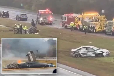 事故发生在上午 8 点 15 分左右,正值上班车流最密集的时段。目击者称,飞机从低空掠过公路后突然坠落,瞬间爆炸成火球,碎片四散,车辆紧急刹车避让,场面一片混乱。