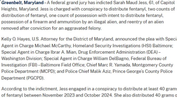 唐人日报4月15日讯:上个月,马里兰州乔治王子县执法部门正式起诉一名非法移民——61岁的莎拉·莫德·杰斯(Sarah Maud Jess),她面临多项重罪指控,包括散发致命毒品芬太尼、非法移民持有枪支,以及作为被定罪遣返者非法再次入境美国。