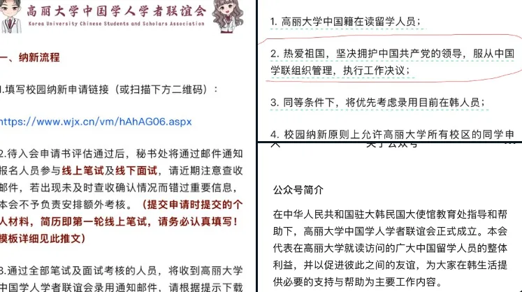 唐人日报2月26日讯:近日,韩国高丽大学中国人学者联谊会发布纳新公告,要求申请者不仅需为高丽大学中国籍在读留学人员,还需热爱共产党,坚决支持中国共产党的领导。此举引发广泛关注和争议。部分网友认为该要求涉嫌政治倾向性强,可能对学术独立性产生影响。