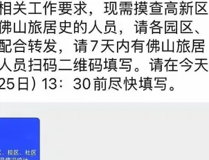 唐人日报7月30日讯:近日高新区发布紧急通知,要求对近期来自佛山的旅居人员进行全面摸排。根据防控工作要求,各园区及企业需迅速行动,积极转发通知并督促相关人员完成登记。凡在过去7天内有佛山旅居史的人员,必须扫码填写信息登记表,提交时间截至今日13时30分。
