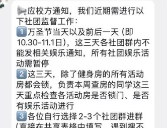 唐人日报10月31日讯:随着万圣节临近,一份来自某高校的内部通知在网络上引发广泛关注与热议。通知要求自10月30日至11月1日期间,全校全面禁止一切娱乐活动,所有学生社团暂停举办文娱类聚会,社团群聊中也不得发布任何与娱乐相关的通知或信息。
