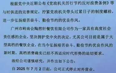 唐人日报7月3日讯:广州市岭南会陶然轩餐饮公司近日发布停业公告,引发舆论热议。该公司自称为“高档餐饮企业”,在公告中表示,为积极响应党中央关于《党政机关厉行节约反对浪费条例》的精神,将于7月2日起正式停止营业,并启动清算程序,承诺尽力妥善安置员工。
