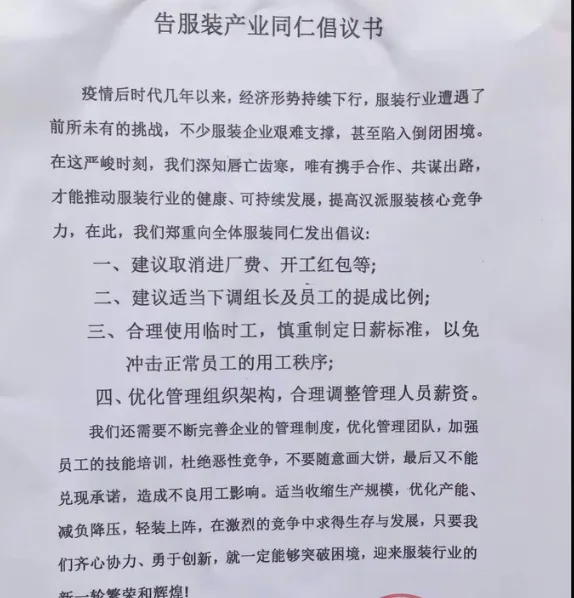 唐人日报2月19日讯:近日,武汉市黄陂区服装协会发布一份倡议书,呼吁各服装企业应对当前经济下行压力。倡议书指出,疫情后经济持续疲软,服装行业面临空前挑战,不少服装企业已出现经营困难,部分企业甚至陷入倒闭困境。