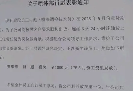 唐人日报6月12日讯:近日,广东佛山酷狄五金公司因“表彰一名6天24小时连轴转未休息的员工并奖励1000元”而引发舆论风波。据悉,该公司公开发布通报,称该员工在工作高峰期连续六天昼夜不停、全程待命,表现出高度敬业精神,公司特此奖励人民币1000元,并号召其他员工“以他为榜样,把公司利益放在第一位”。