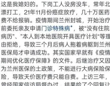 据网友讲述,妻子在2021年确诊癌症,治疗期间医疗费用高昂,花费数十万元。更令人绝望的是,因为兰州当地政策的限制,他们无法享受大病医保报销。夫妻俩奔走于各个部门求助,却在重重审批和推诿中屡屡碰壁。