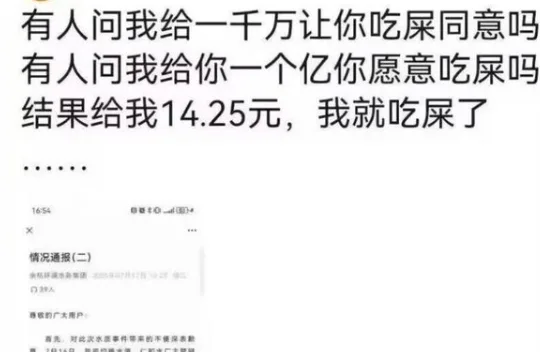 这一“补偿”方案迅速引发民愤。一名网友怒斥:“网上常说‘给你一个亿你愿不愿意吃屎’,我现在喝了屎水,结果给了14块钱,连一顿外卖都不够,笑死。”
