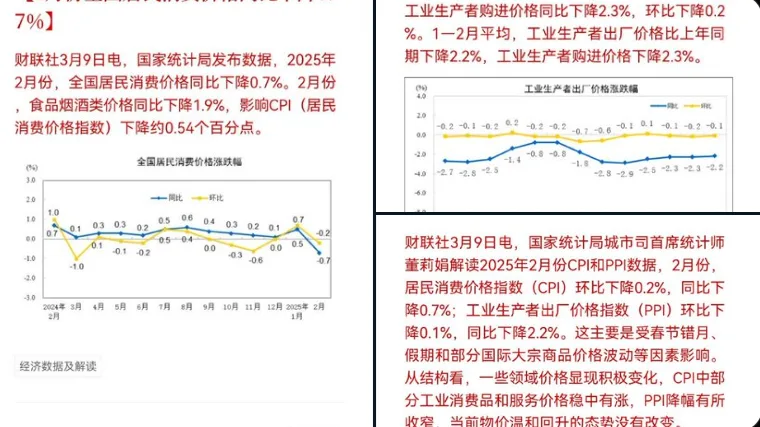 唐人日报3月13日讯:近日,根据国家统计局最新发布的数据,2025年2月份,中国全国居民消费价格指数(CPI)同比下降了0.7%,显示出消费市场的通缩趋势。同时,全国工业生产者出厂价格指数(PPI)同比下降2.2%,环比下降0.1%,反映出工业产品价格持续下滑的态势。