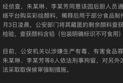 警方调查发现,幼儿园工作人员通过网络购买了标注“不可食用”的彩绘颜料,并私自稀释后用于蛋糕、点心等食品装饰。7月3日凌晨,执法人员在幼儿园查获了藏匿的剩余颜料,经检测确认其中含有高浓度铅成分。该园多名教师在异地检测中亦被发现血铅水平异常。