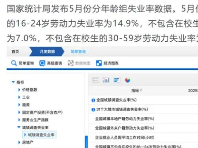 唐人日报6月19日讯:6月,国家统计局公布了2025年5月份按年龄划分的全国城镇失业率数据,引发社会广泛关注。数据显示,16-24岁群体(不含在校生)的失业率高达14.9%,依旧处于高位,反映出青年就业形势依然严峻。