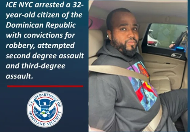 唐人日报4月23日讯:美国移民与海关执法局(ICE)纽约执法与遣返办公室(ERO New York)近日逮捕一名涉嫌严重暴力犯罪的非法移民。据通报,该男子为32岁的多米尼加共和国公民,因涉及抢劫、二级袭击未遂及三级袭击等罪名被控。