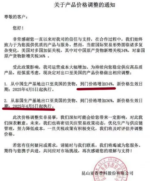 唐人日报4月3日讯:面对特朗普政府新一轮对中国商品加征高额关税的举措,昆山亚香香料股份有限公司近日发布价格调整通知,决定对出口美国的产品全面提价,以应对急剧上升的贸易成本压力。