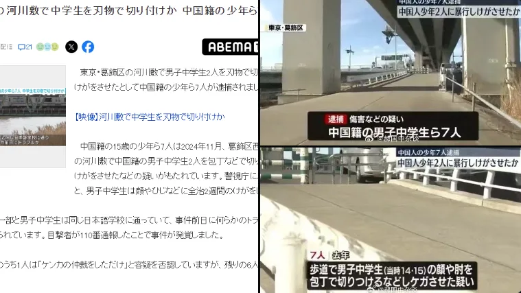 唐人日报2月26日讯:近日,7名中国籍初中生因涉嫌在2024年11月17日,在东京葛饰区平川大桥上围堵并持菜刀砍伤2名同胞学生而被捕。警方表示,涉案人与被害人均为当地日语学校的学生,事发前双方曾发生口角。
